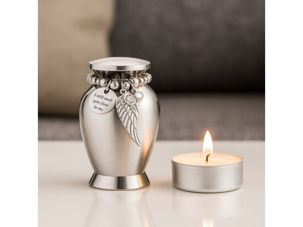Mini urna z nehrdzavejúcej ocele s ozdobným prstencom a odkazom.