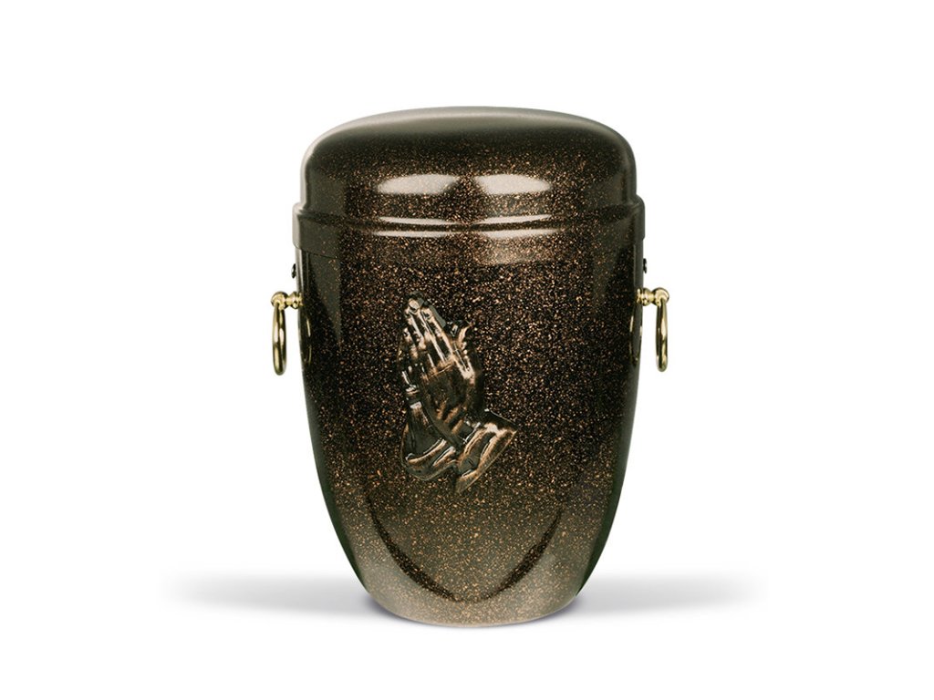 Oceľová urna má hnedo-zlatý škvrnitý povrch, zdobená je 3D motívom ruky v modlitbe